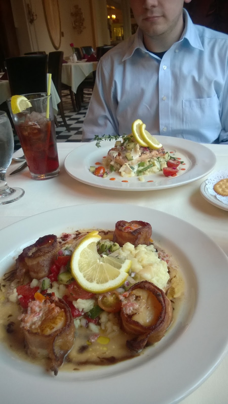 We drove a little bit out of town to visit the apple Orchard (which is where they give the Hot Air Balloon Rides). It was too windy for anyone to take rides, but down the road was a really good German Restaurant. We had a delicious lunch and we got the 4 beer sampler (I don't usually drink,but it's my honeymoon. I didn't drink a ton but I tried local wines, etc). We drove over the historic lift bridge that crosses the St. Croix River. Then we ate dinner in the George Washington Room of the Lowell Inn, which was built in the 1920's. Andrew took a picture for couple sitting a table away (it was her 82 birthday and her husband brought her there, he hadn't been there since 1940s). Picture: Andrew had the Bre Salmon with Lemon Buerre Blanc Sauce and I had Bacon wrapped scallops in a red pepper creamy risotto.